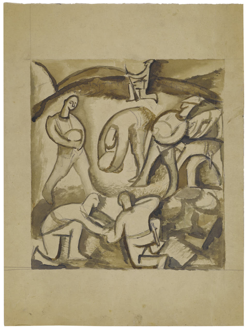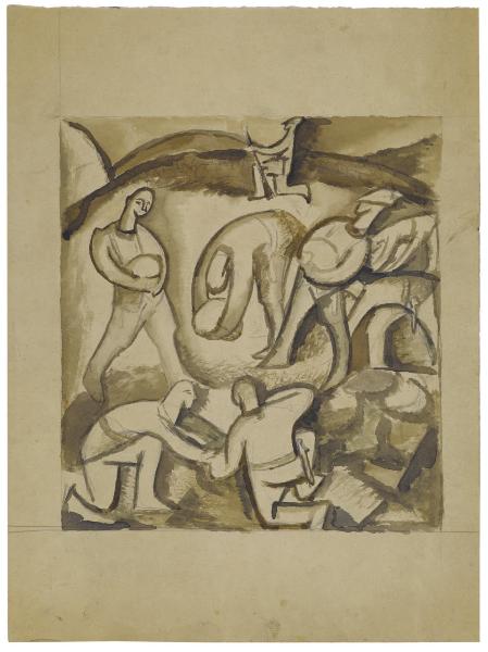 - NOTIZIE STORICO CRITICHE Nel 1913 Funi prende parte al movimento milanese Nuove Tendenze fondato da Leonardo Dudreville, che se pur classificato come afferente al Futurismo moderno costituiva un momento importante di differenziazione dal Futurismo di Marinetti. Nel 1915 Funi, insieme a un gruppo di altri artisti si arruola nel Corpo Nazionale dei Volontari Ciclisti Automobilisti e insieme a loro partecipa alla presa di Dosso Casina. Fra le trincee e durante le pause dalle operazioni belliche realizza più di cinquecento schizzi a penna, matita o acquerello, nel quale non descrive la visione eroica della battaglia, ma raffigura invece scene ordinarie di vita militare. Di questi fogli, la maggior parte dei quali dispersi nelle operazioni di ritorno dal fronte, dodici opere (invv. 2773 B 1010; 2774 C 359; 2775 B 1011; 2776 B 1012; 2777 B 1013; 2778 B 1014; 2779 B 1015; 2780 B 1016; 2781 B 1017; 2782 B 1018; 2783 B 1019; 2783 B 1020;) sono stati acquistati nel marzo del 1938 dalla Galleria del Milione, presso la quale l'artista aveva esposto nella primavera dell'anno precedente una serie di disegni e tempere risalenti al periodo compreso tra 1911 al 1920, oltre ad alcuni cartoni per affreschi. È probabile pertanto che i disegni in questione furono presentati alla mostra del pittore ferrarese in quella stessa occasione sebbene non vi siano documenti che ne attestino la presenza all'interno dell'esposizione. Tra questi, quello intitolato "Costruzione di una trincea sull'altissimo", si distingue dagli altri eseguiti a matita o acquerello mediante segni e linee essenziali, per una ricerca costruttiva della composizione, caratterizzata da una rappresentazione di forme e volumi sensibili alle suggestioni legeriane vive in quegli anni. Nel foglio, acquerellature di marrone e grigio compongono le cinque figure della scena all'interno di un ritmo di volumi e colori terrosi in cui è presente una sintesi compositiva d'ispirazione cubista e cezanniana.