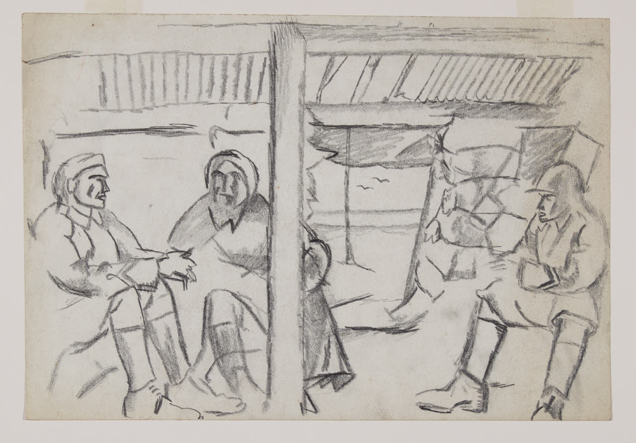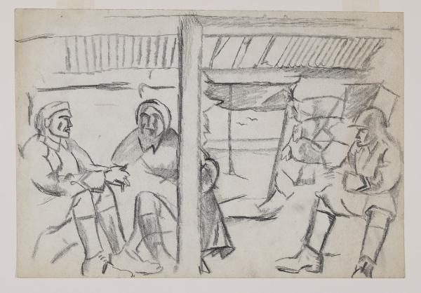 - NOTIZIE STORICO CRITICHE Allo scoppio della Prima Guerra Mondiale, molti artisti favorevoli all'intervento dell'Italia in guerra, accanto alla Francia, alla Gran Bretagna e alla Russia, si schierano nel fronte interventista arruolandosi come volontari. I futuristi di stretta osservanza, insieme a quelli indipendenti vicini al movimento che confluiranno nel gruppo di "Nuove Tentenze", furono tra i più accaniti interventisti, desiderosi di sconfiggere l'impero asburgico e ricongiungere Trento, Trieste e Gorizia alla patria. Nel maggio 1915 infatti Boccioni, Bucci, Erba, Funi, Marinetti, Piatti, Sant'Elia e Sironi entrano a far parte del Corpo Nazionale dei Volontari Ciclisti Automobilisti e partecipano alla presa di Dosso Casina. \nFuni, che in seguito combatterà come tenente dei bersaglieri sul Piave fino al 1917, fra le trincee e durante le pause dalle operazioni belliche realizza più di cinquecento schizzi a penna e inchiostro, matita e acquerelli, nei quali non descrive la visione eroica della battaglia, ma raffigura invece scene ordinarie di vita del campo militare. Di questi fogli, la maggior parte dei quali dispersi nelle operazioni di ritorno dal fronte, dodici opere (invv. 2773 B 1010; 2774 C 359; 2775 B 1011; 2776 B 1012; 2777 B 1013; 2778 B 1014; 2779 B 1015; 2780 B 1016; 2781 B 1017; 2782 B 1018; 2783 B 1019; 2783 B 1020) sono state acquistate nel marzo del 1938 dalla Galleria il Milione, presso la quale l'artista avevo esposto, nella primavera dell'anno precedente, una serie di disegni e tempere risalenti al periodo compreso tra 1911 al 1920, oltre ad alcuni cartoni colorati realizzati per gli affreschi di Ferrara e di Tripoli. È probabile pertanto che i disegni in questione furono presentati alla mostra del pittore ferrarese in quella stessa occasione, nonostante l'assenza di documenti che ne attestino l'effettiva presenza all'interno dell'esposizione. \nIn queste opere Funi non indaga l'evento tragico della guerra, le emozioni o i sentimenti dei compagni di battaglia, ma esprime il desiderio di descrivere la realtà quotidiana attraverso una formula fortemente sintetica. All'interno di trincee e baracche, le sagome dei soldati sono descritte mediante segni e linee essenziali che in alcuni casi si irrobustiscono mentre in altri si spezzano; inoltre, all'interno delle diverse composizioni le figure più abbozzate acquistano una maggiore stabilità, senso prospettico ed equilibrio compositivo nei rapporti tra forma e dimensioni. Tali fogli sono la sintesi di un percorso autonomo legato ancora alla sigla cubo-futurista che a sua volta si somma a un segno cezanniano del tutto personale. Oltre alla matita dal segno grosso e spesso interrotto, Funi crea delle composizioni con acquerelli corposi, in cui le figure si innestano all'interno del paesaggio che le circonda, diventando un tutt'uno con esse. In queste opere "non c'è differenza tra il bersagliere e la gavetta che tiene in mano; i soldati di Funi sono volti senza volto, l'emozione è nella forma, nel ritmo dei volumi, mai nell'espressione individuale" (De Stasio 1991). \nSul verso di ogni foglio è presente l'iscrizione a matita con la data e l'indicazione della scena raffigurata.
