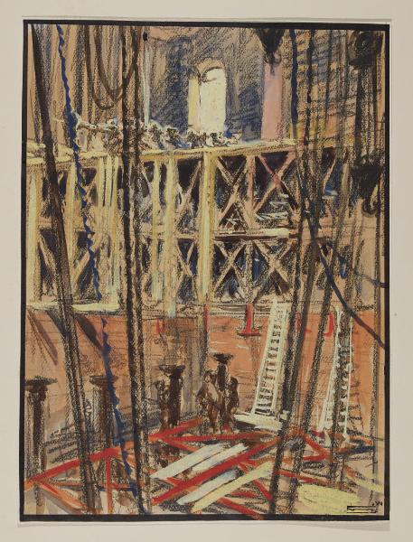 • NOTIZIE STORICO CRITICHE Alfredo Furigà nel corso degli anni Venti lavora intensamente come scenografo teatrale. Nel 1932 espone alla Galleria del Milione, tornandovi nuovamente due anni dopo, stavolta in Libreria. Alla mostra del 1932, le raccolte civiche milanesi acquistano il foglio intitolato Interno del palcoscenico del teatro reale dell'opera di Roma, un disegno che testimonia la sua attività di scenografo, pur non avendo avuto nessuna finalità operativa (Vilardi 2001-2002).Riquadrato da una cornice di colore nero, il disegno è realizzato a carboncino con colori a tempera e acquerello. Al centro della scena, in alto, una finestra ad arco fa da perno al sistema di linee che attraversano il palcoscenico, tratteggiate dalle impalcature di legno e dalle corde. La luce, proveniente dalla finestra, si pone oltre che come punto focale della composizione, anche come elemento principale di attrazione per l'osservatore. "Il taglio scelto per la composizione è solenne, e le corde in primo piano aiutano l'occhio a misurare la vastità dello spazio descritto, accentuata dagli effetti chiaroscurali" (Ivi.).