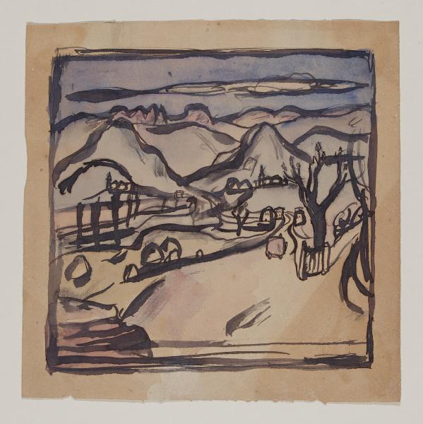 - NOTIZIE STORICO CRITICHE Il disegno rappresenta, come molte altre opere dell’artista, un paesaggio di montagna. Si scorgono in lontananza i profili delle vette, mentre in primo piano la scena è occupata da mulattiere, alberi e piccoli villaggi. La linea di contorno, spessa e accentuata, sembra incastrare e bloccare il colore puro e tenue come nella tecnica di lavorazione degli smalti colorati a cloisonné. Se, certamente, nella resa del paesaggio, l’artista tradisce un retaggio realista tardo ottocentesco, non si può non notare quanta importanza abbiano avuto nella sua formazione le nuove tendenze di matrice europea come il Fauvismo o la corrente dei Nabis. Pur in un soggetto così legato alla quotidianità e alla propria terra, Garbari denota dunque una cultura figurativa attenta alle novità artistiche internazionali coeve.