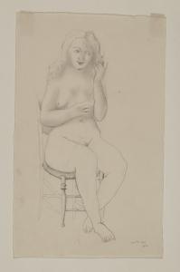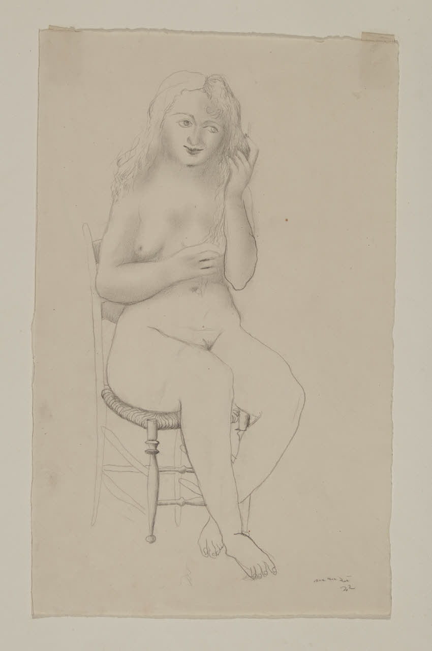 - NOTIZIE STORICO CRITICHE Nella grafica di Giacomo Manzù persistono stimoli appartenenti alla tradizione classica che l'artista reinterpreta in maniera popolaresca seguendo l'impostazione lombarda. Le opere dei primi anni Trenta sono caratterizzate da un delicato romanticismo a cui è associato uno spontaneo primitivismo. Tali caratteristiche sono visibili nel foglio, acquistato dall'artista nel 1932 dalle raccolte pubbliche milanesi e intitolato "Nudo di donna seduta". Manzù raffigura una giovane fanciulla che amorevolmente accarezza i suoi capelli. La figura femminile è permeata da una particolare dolcezza che la allontana da una tipica visione erotica di nudo. Essa risulta descritta da un sottile tratto di matita e da un leggero chiaroscuro non omogeneo.