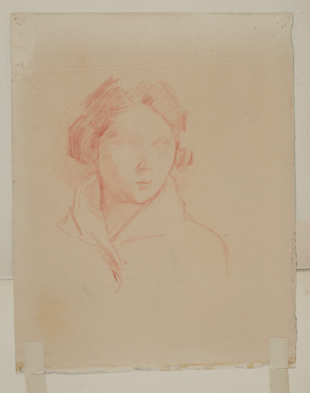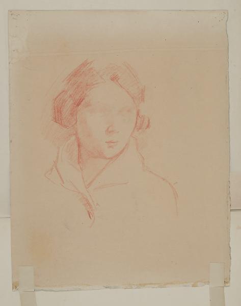 - NOTIZIE STORICO CRITICHE Lo schizzo di una testa femminile è da indentificare con la figura di Anna, violoncellista boemo-ungherese e moglie di Enrico Sacchetti, conosciuta dall’artista in Argentina nel suo periodo di permanenza in Sud America (1908-1911). La donna, rappresentata numerosissime volte dall’amato, è descritta in questo foglio con il capo leggermente rivolto a destra, pettinata secondo la moda di quegli anni e vestita da un elegante soprabito. I particolari del suo volto, il naso e la piccola bocca, risultano solamente accennati, mentre del tutto cancellati sono gli occhi, evidentemente per un ripensamento mai più portato a termine. Nonostante l’assenza di particolari fisiognomici ben definiti, il delicato chiarosuro creato con tratti incrociati e veloci di sanguigna, dona al disegno una soave bellezza. La posa elegante e composta della figura, inoltre, fa pensare a un ritratto non finito eseguito rapidamente dal vero. Il foglio è stato acquistato dalla Galleria Pesaro nel 1920 in occasione della mostra personale dell’artista, introdotta nel catalogo da Ugo Ojetti. Sul suo recto è presente un disegno denominato "Prigionieri tedeschi" (inv. 6257/1 D 474 Recto) probabilmente quest’ultimo esposto, tra il maggio e il giugno, alla mosta sopra citata.