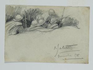 - NOTIZIE STORICO CRITICHE Sono gli anni della Prima Guerra Mondiale: Alberto Salietti ha 23 anni quando viene chiamato a combattere al fronte, e nei tre anni passati in battaglia esegue una serie di opere grafiche tra le più belle che ci sono finora pervenute. Dell'artista ferrarese il Gabinetto di Disegni del Castello Sforzesco conserva un gruppo di sette piccoli fogli di taccuino risalenti a questo periodo (invv. 6286 A 1936; 6287 A 1937; 6288 A 1938; 6289 A 1939; 6290 A 1940; 6291 A 1941; 6292 A 1942), acquistati dalla Galleria Casa d'Artisti nel 1933. Essi illustrano, attraverso un forte equilibrio chiaroscurale e un attento studio dell'impaginazione, alcune delle vicende vissute dai soldati al fronte. Sono appunti grafici eseguiti a carboncino, alcuni dei quali realizzati frettolosamente in trincea, nei campi di battaglia o nei momenti di pausa. In essi l'artista crea atmosfere intense grazie alla sapiente ponderazione di luci e ombre. Le figure dei soldati sono bloccate in diverse situazioni, all'interno di spazi angusti, nel sotterraneo della trincea, nella vasta campagna, riuniti intorno a una mensa o in piedi come vedette. Seppur ancora legati alla tipica tradizione ottocentesca lombarda, tali disegni sono caratterizzati da una sicurezza nello studio della composizione e da una plasticità delle forme che preannuncia quanto avverrà nella pittura dell'artista intorno agli anni Venti.\nUna suggestiva descrizione di questi fogli è quella formulata da Marina De Stasio, la quale scrive: "I Sette disegni di guerra sono opere curate, disegni realizzati con forte segno pittorico, l'immagine è tagliata originalmente, in modi diversi a seconda del tema della composizione; le figure sono senza volto, ma non senza anima, c'è un sentire collettivo, un soffrire in vari modi la stessa ansia". E continua: "al vivo interesse formale, che si manifesta per esempio nell'attenzione all'uso dello spazio bianco del foglio di carta, si accompagna un'intensa consapevolezza del dramma che sta avvenendo" (De Stasio 1991).\nInoltre, come ricordato da Arnanda Dallaj, disegni analoghi "vennero preparati nel 1917 per corredare nella 'Lettura' di dicembre il frontespizio e la prosa di G. Castellini Ore di un diario non scritto (pp. 935-939)" (Dallaj 1991).