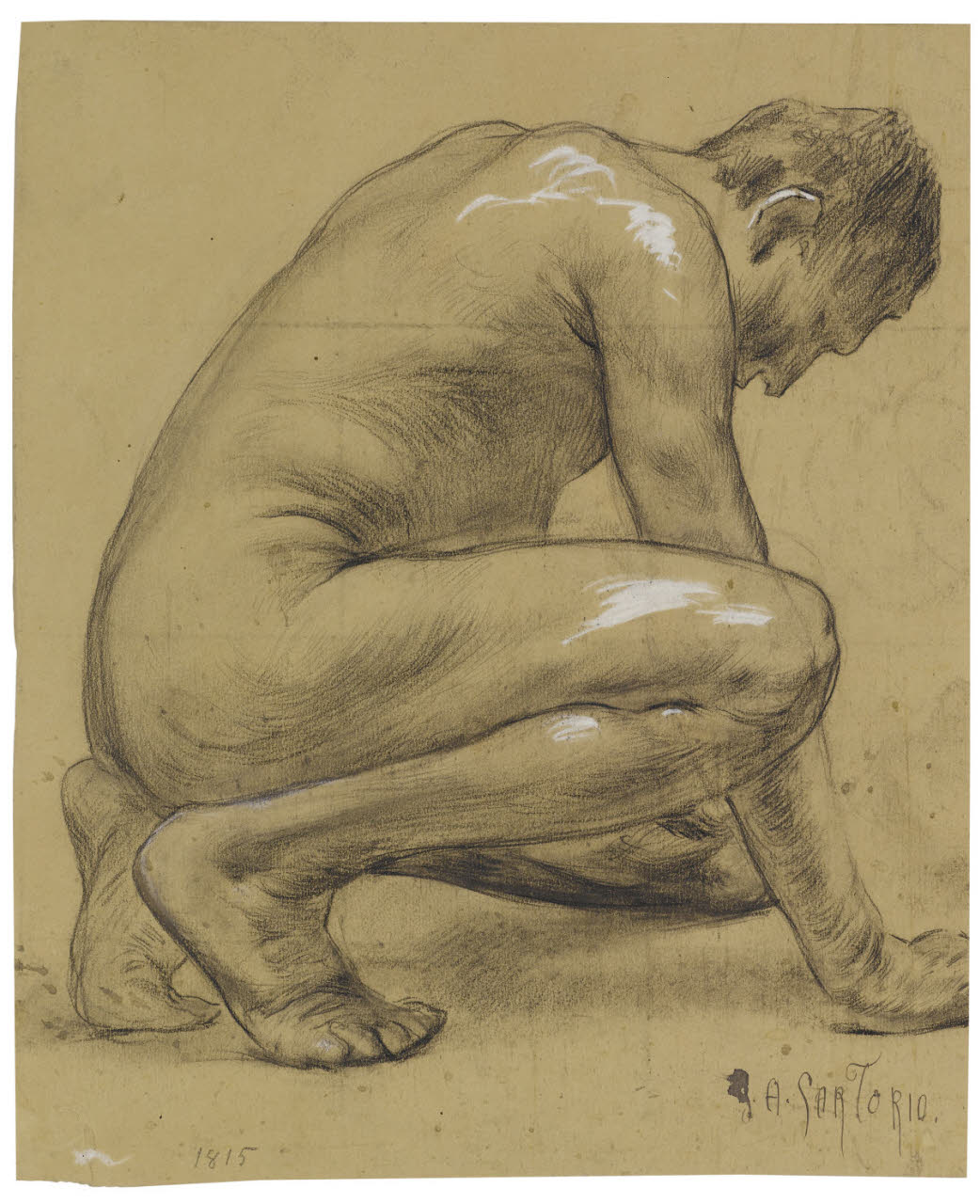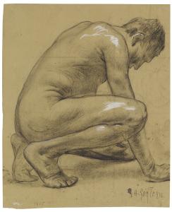 - NOTIZIE STORICO CRITICHE Abilissimo disegnatore e brillante colorista, nei suoi nudi Giulio Aristide Sartorio tradisce chiaramente lo studio dei modelli michelangioleschi ripresi secondo le regole del classicismo italiano, ma con una monumentalità e un'idealizzazione che proviene dai contatti con la cultura contemporanea d'oltralpe e in particolar modo con l'ambiente viennese e monacense. \nIl disegno eseguito dall'artista romano e posseduto da Vittore Grubicy, venne donato nel 1920 alle raccolte pubbliche. Ricorda le nude figure realizzate da Sartorio nel Fregio decorativo del Lazio e nel Fregio del Parlamento, e in particolar modo rimanda alle pose scultoree dei cariatidi presenti in tali cicli. Nel disegno i tratti paralleli realizzati in carboncino creano sfumature di ombre che seguono l'andamento del corpo e, sovrapponendosi tra di loro, producono un chiaroscuro che si contrappone alle leggere lumeggiature date a gessetto bianco.