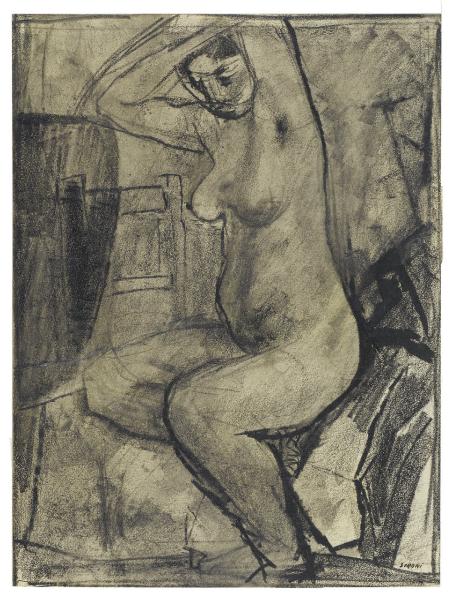 - NOTIZIE STORICO CRITICHE Due sono le categorie principali a cui afferiscono la maggior parte dei disegni realizzati da Mario Sironi nel corso della sua lunga vita: quella a carattere illustrativo, che consta di disegni destinati alla pubblicazione in riviste e periodici, e pertanto contraddistinti da un sapore politico e satirico, e un'altra in cui confluiscono schizzi e modelli per grandi e piccole composizioni, che si distinguono per una spiccata ricerca di sintesi formale. Un esempio in tal senso è questo disegno con un nudo femminile, acquistato presso la Galleria Milano nel 1931. Scelto come esempio di grafica all'interno del panorama dell'arte italiana antica, moderna e contemporanea in occasione dell'esposizione internazionale di San Francisco nel 1939, per il tipo di raffigurazione e il modo in cui è concepita la composizione può essere accostato, all'interno della produzione pittorica dell'artista, ai dipinti "Bagnante" e "Nudo di schiena" (Mario Sironi 1973, tavv. 74 e 75) e quindi datato intorno al 1928 (Dallaj 1991). La figura della donna, abbozzata da una linea netta, è ricoperta da un intenso chiaroscuro ottenuto attraverso differenti gradi di pressione del carboncino, che conferiscono all'opera connotati di pregevole intensità luministica.