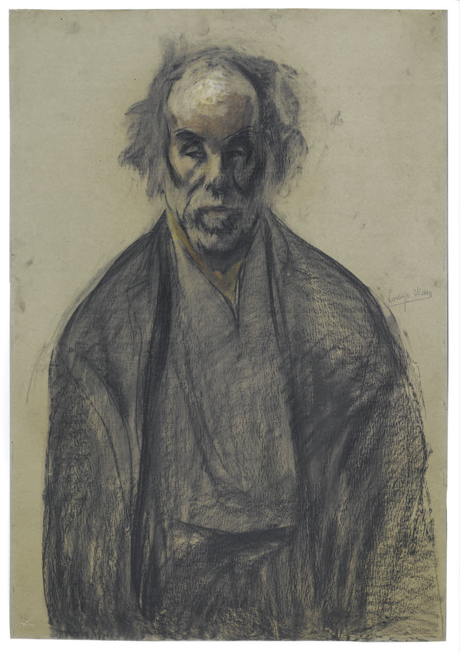 - NOTIZIE STORICO CRITICHE Le opere di Lorenzo Viani dei primi anni Dieci del Novecento si contraddistinguono per la presenza di figure umane abbandonate a un'esistenza fatta di stenti e sacrifici. I suoi protagonisti sono pescatori, contadini, profughi e mendicanti, uomini distrutti dalla miseria e dalle sventure. Il grande disegno del "Bevitore", oggi conservato all'interno del Civico Gabinetto di Disegni del Castello Sforzesco, è eseguito dall'artista toscano con pastosi tratti neri di pastello e carboncino e rappresenta la figura emaciata di un vecchio uomo a mezzo busto visto frontalmente. La sua espressione triste e malinconica è messa in risalto dallo sguardo rivolto lateralmente verso il basso. Il suo viso, inoltre, è descritto con particolare naturalismo attraverso leggere sfumature di biacca, che ne illuminano la fronte stempiata, e dai segni di un pastello terroso, che ne evidenziano con particolare incisività i tratti fisiognomici. L'espressione malinconica e le spalle spioventi, appesantite da una veste pateticamente consumata, sottolineano la povertà dell'uomo ed enfatizzarono la propria solitudine. Il foglio, acquistato in occasione dell'Esposizione personale delle opere di Lorenzo Viani nel 1915, è indicato nel catalogo della mostra con un nome diverso, molto probabilmente con il titolo "L'ubriaco".