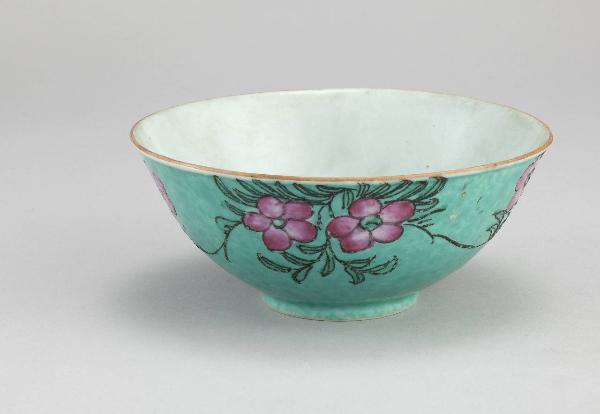 Ciotola internamente a smalto bianco, esternamente verde con decorazioni floreali policrome. Marca in azzurro alla base.
