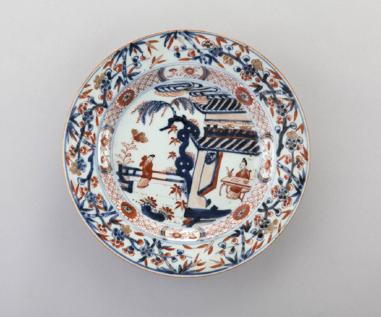 Piatto in porcellana a smalti Imari nei toni del blu e del rosso con lumeggiature decorato al centro con scena di figure in giardino e padiglione, bordatura con rami di bambù.