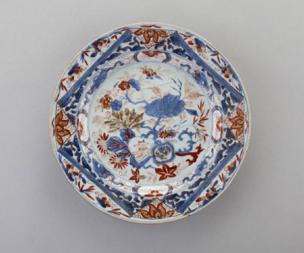 Piatto in porcellana a smalti Imari nei toni del blu e del rosso con lumeggiature decorato con motivi floreali e geometrici.