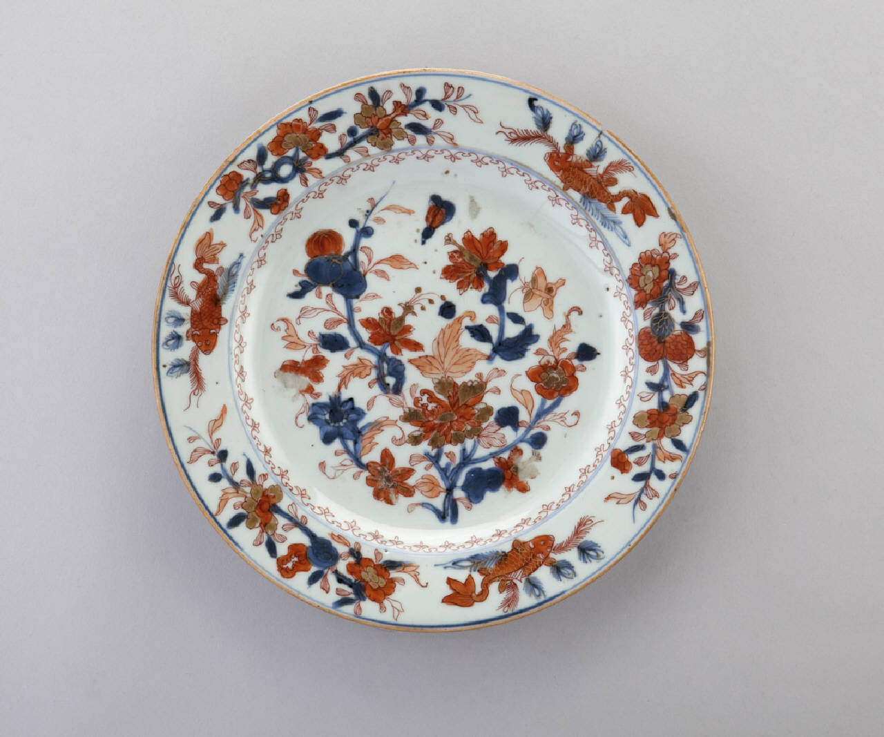Piatto in porcellana a smalti Imari, in blu sotto coperta e rosso e oro sopra coperta. Al centro motivi floreali con cartiglio campito da pagoda sulla tesa motivi geometrici e carpe in rosso.