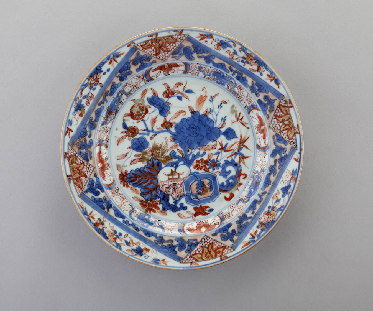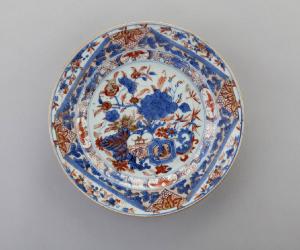 Piatto in porcellana a smalti Imari nei toni del blu e del rosso con lumeggiature decorato con motivi floreali e geometrici.