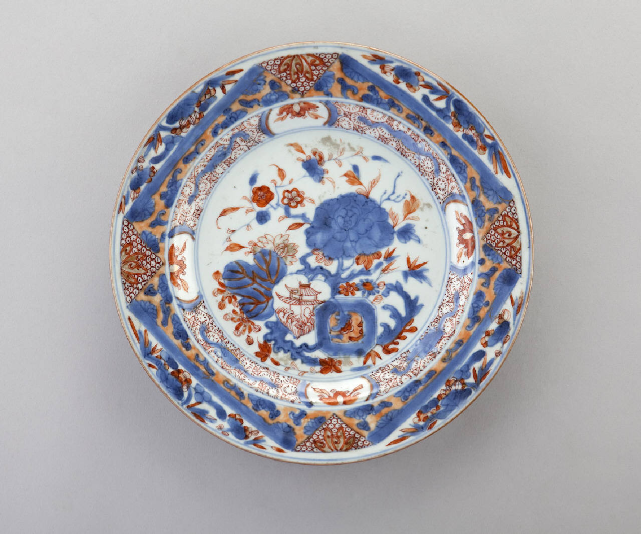 Piatto in porcellana a smalti Imari nei toni del blu e del rosso con lumeggiature decorato con motivi floreali e geometrici.