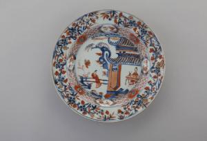 Piatto in porcellana a smalti Imari nei toni del blu e del rosso con lumeggiature decorato al centro con scena di figure in giardino e padiglione, bordatura con rami di bambù.