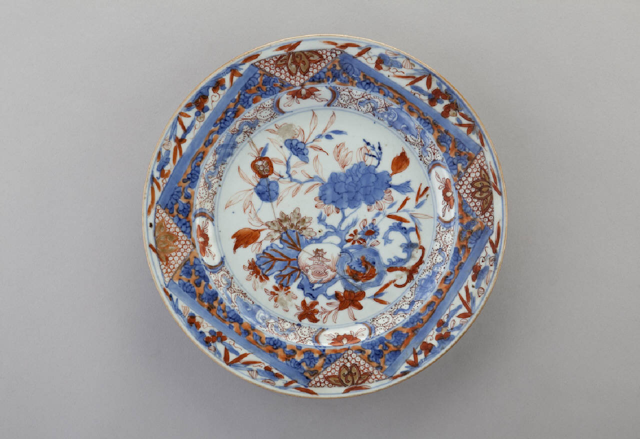 Piatto in porcellana a smalti Imari nei toni del blu e del rosso con lumeggiature decorato con motivi floreali e geometrici.