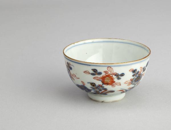 Coppetta in porcellana a smalti Imari nei toni del blu e del rosso con lumeggiature, decorata con motivi floreali.