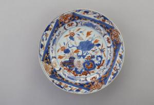 Piatto in porcellana a smalti Imari nei toni del blu e del rosso con lumeggiature, decorato con motivi floreali e geometrici.