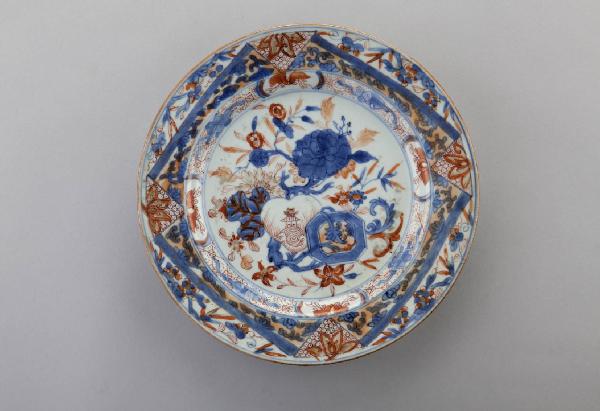Piatto in porcellana a smalti Imari nei toni del blu e del rosso con lumeggiature, decorato con motivi floreali e geometrici.