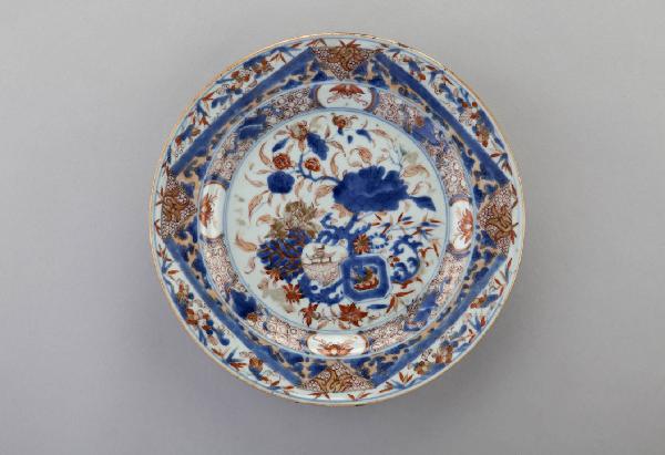 Piatto in porcellana a smalti Imari nei toni del blu e del rosso con lumeggiature, decorato con motivi floreali e geometrici.
