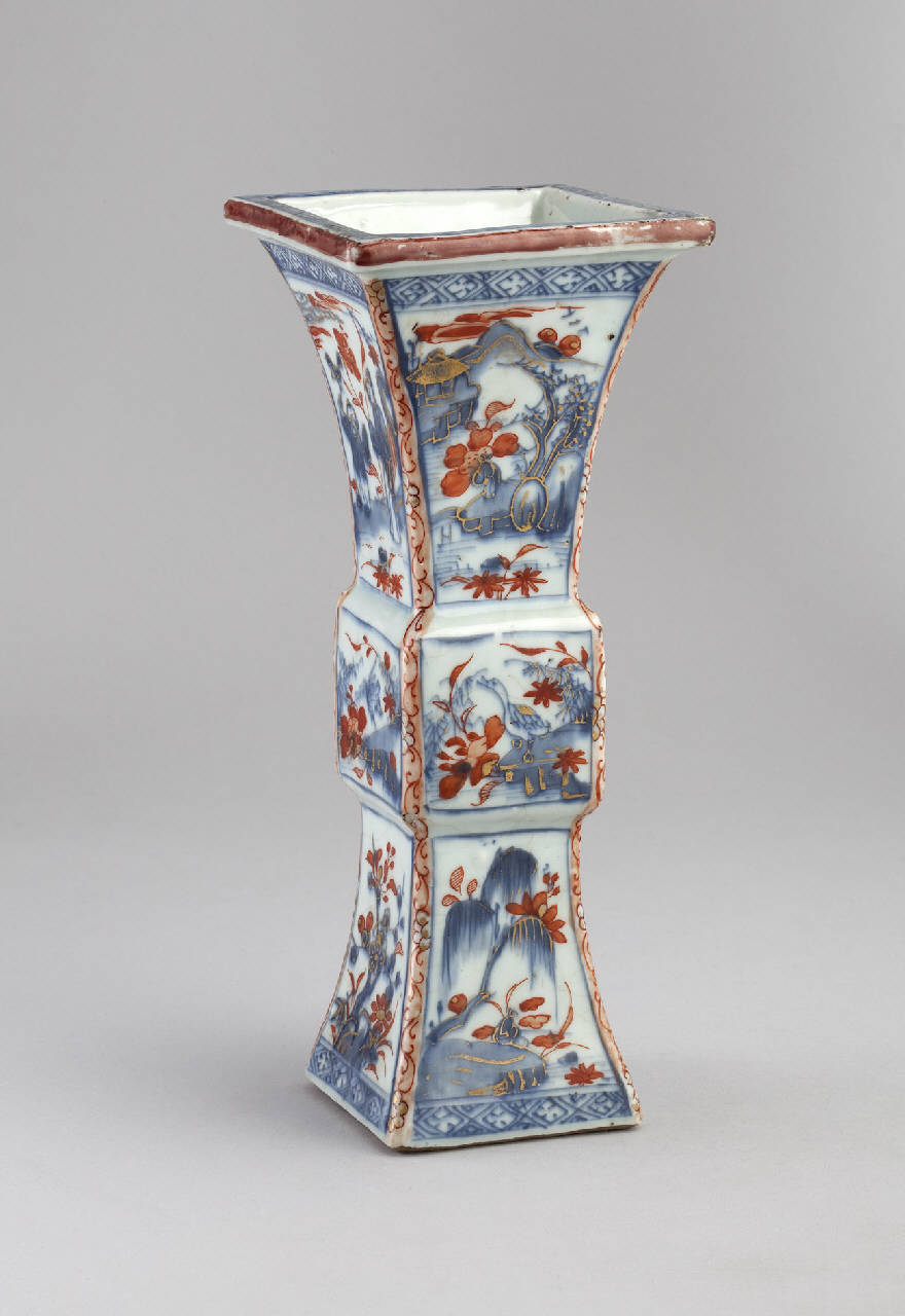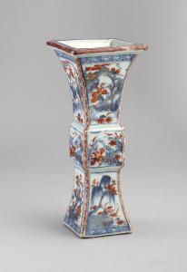 Vaso dalla forma arcaica "gu" a sezione quadrata, in porcellana a smalti Imari nei toni del blu e del rosso con lumeggiature, decorato con scene di paesaggio e motivi floreali.