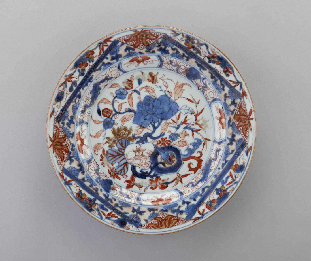 Piatto in porcellana a smalti Imari nei toni del blu e del rosso con lumeggiature, decorato con motivi floreali e geometrici.