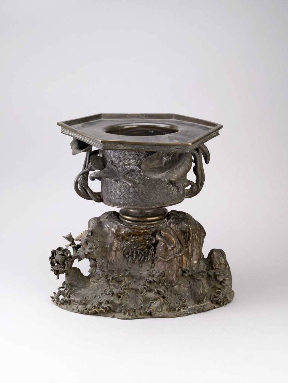 Due vasi ornamentali in bronzo con base staccata, con orlo esagonale ornato da meandri sul bordo. Il corpo cilindrico è ornato da volatili a rilievo e tralci fioriti. La base a forma di scogliera con serpente avvolto sopra una pietra. (descrizione di P. Amadini).