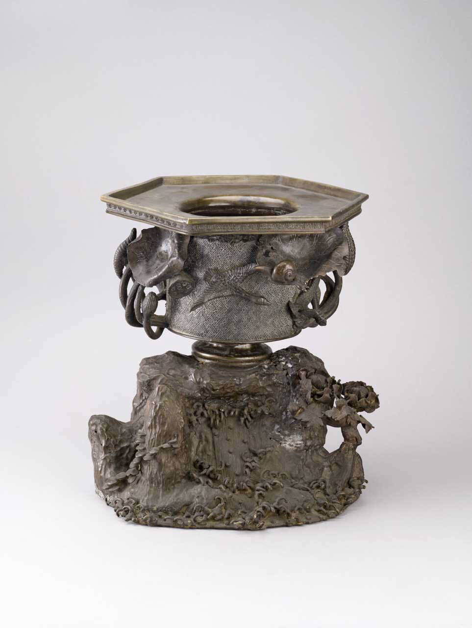 Due vasi ornamentali in bronzo con base staccata, con orlo esagonale ornato da meandri sul bordo. Il corpo cilindrico è ornato da volatili a rilievo e tralci fioriti. La base a forma di scogliera con serpente avvolto sopra una pietra. (descrizione di P. Amadini).