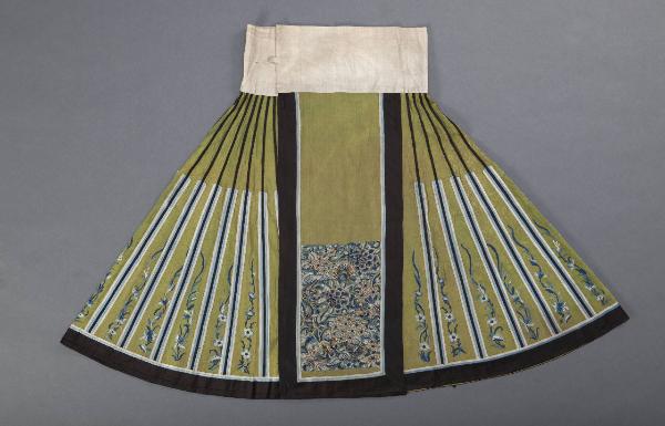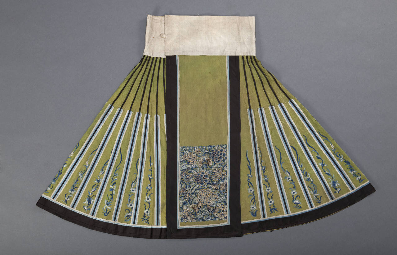 Gonna in seta operata e ricamata con uccelli e motivi floreali nei toni del blu fondo verde chiaro, bordato i nero, apertura a falda, foderata in rosa, con bordo superiore in tela.
