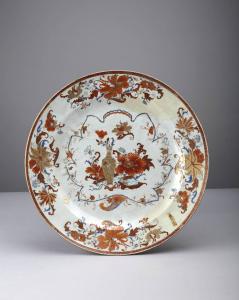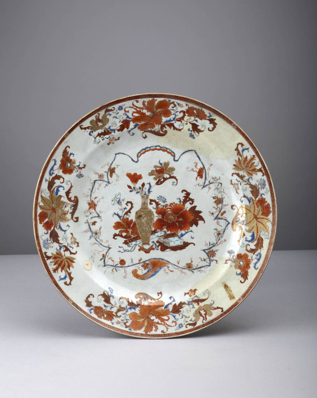 Piatto in porcellana a smalti Imari nei toni del blu e del rosso con lumeggiature decorato al centro con vaso, pila libri e fiori di peonia all'interno di cartella a guisa di foglia, bordato da ulteriori motivi floreali
