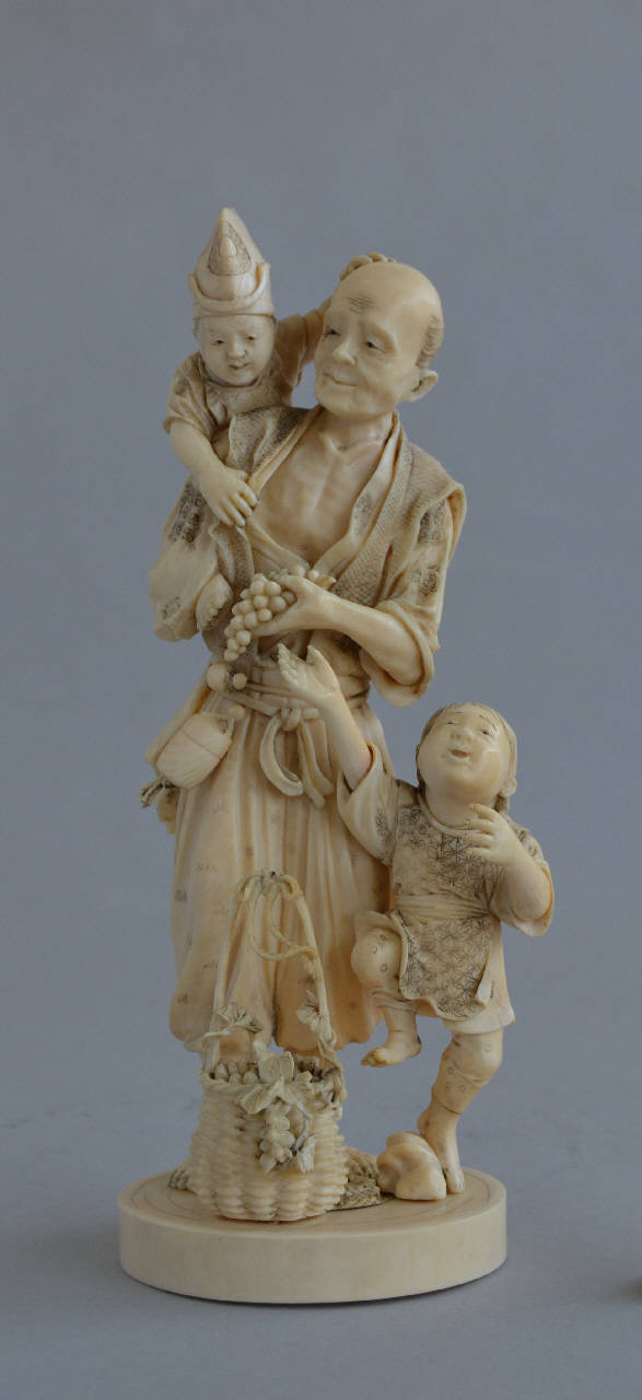 Statua di anziano con due bambini. Un bambino, aggrappato sulla spalla destra dell'uomo, indossa un cappello a punta, morbido con un simbolo circolare di casata (mon). L'altro bambino sta alla sinistra dell'uomo e tiene un piede alzato mentre l'altro poggia su una pietra (o una conchiglia?) e tende il braccio destro e lo sguardo verso l'alto. L'uomo ha ai pidei una cesta piena d'uva e tiene un grappolo nella mano sinistra. Alla sua cintura è appesa una scatoletta di legno a più strati (inro) tenuta da un fermaglio a forma di zucca. La composizione fa corpo con una base spessa, circolare al cui centro sul fondo si trova la firma dell'autore incisa a tre caratteri entro una cornice composta di tre cerchi concentrici.