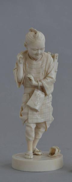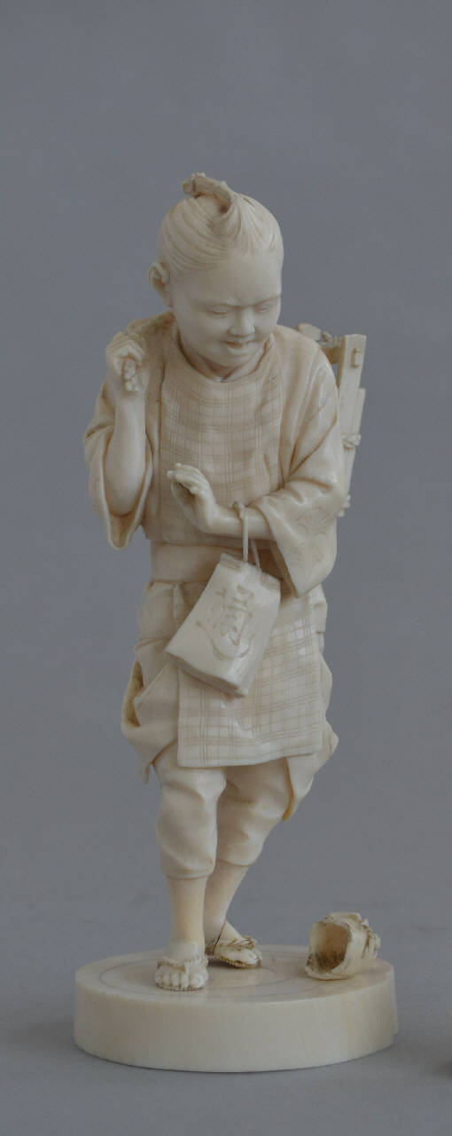 Statuetta raffigurante un ragazzino che vende sake. Il ragazzino ha appena fatto cadere una bottiglia di terraglia che teneva sulla schiena assieme ad altre due e a una botte di legno a corna (tsunodaru), assicurate a una corda tenuta con la mano destra. La sinistra è portata davanti e regge uno blocchetto di fogli con un carattere iscritto al centro del primo foglio. La composizione fa corpo con una base bassa e circolare. Alla cintola, sulla schiena, pende un'altro blocchetto con iscritti due caratteri. Lo sguardo del ragazzino mostra tutto il suo disappunto. Al centro della base del piedistallo è incastonato un quadratino d'avorio con doppia cornice incisa campita da tratti sinuosi.