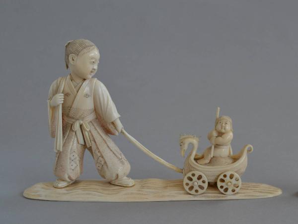Scultura in avorio di ragazzino con i capelli raccolti in una piccola coda e vestito con un abito tradizionale riccamente elaborato, che tira un piccolo carretto giocattolo, con quattro ruote, a forma di uccello, dentro il qualevè seduto un bambino molto piccolo, seminudo, che tiene un bastoncino fra le mani. La scena è intagliata su una base ovale allungata che rappresenta uno sterrato. Tracce di pigmento rosso e sulle righe del broccato a motivo di rombi e di onde che si trovano sui pantaloni e sul giacchetto. I rombi sono campiti al centro da puntini neri. Firma a due caratteri sul fondo. Fa corpo con una base moderna in legno con piedi a ricciolo.