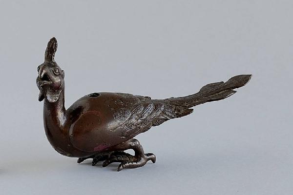 Statuetta in bronzo di piccole dimensioni raffigurante un pavone accosciato, con il capo leggermente girato alla sinistra. Sotto il becco, aperto, sono evidenti i bargigli. Sul dorso, un foro per l'inserimento dei bastoncini d'incenso. Patina bruno rossiccia.