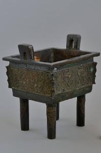 Incensiere a forma di vaso quadripode rituale per la cottura dei cibi (fangding). Corpo rettangolare, ornato a basso rilievo con mascheroni taotie ageminati in argento su fondo di greche a meandri (leiwen) e ai vertici sporgenze modanate. Il corpo centrale posa su alti piedi tubolari incisi a motivo arcaicistico di cicala (chanwen). Due anse ad arco superiormente ageminate da una banda d'argento, spuntano verticalmente dai due lati minori della tesa orizzontale della bocca, leggermente inclinate verso l'esterno. Patina artificiale verde su bronzo bruno scuro.