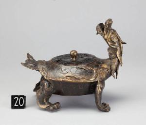 Incensiere di bronzo a forma di chimera Hiiki (Bishi) (detta in cinese bixi o meno frequentemente baxia, o drago-tartaruga guilong), dalla forma di tartaruga, con testa e coda di drago. La testa è girata all'indietro e le fauci sono aperte. Il bordo del carapace è decorato con una fascia a greche (leiwen). Il fornello, realizzato al centro del carapace, è sormontato da un coperchio piatto, traforato con motivi di trigrammi Hakke (in cinese ba gua) nella disposizione circolare detta "prima sequenza celeste" o di Fuxi (Fuxi Bagua). Al centro del coperchio un pomello sferico.\nIl bronzo è patinato di scuro ed è dorato in alcuni punti.