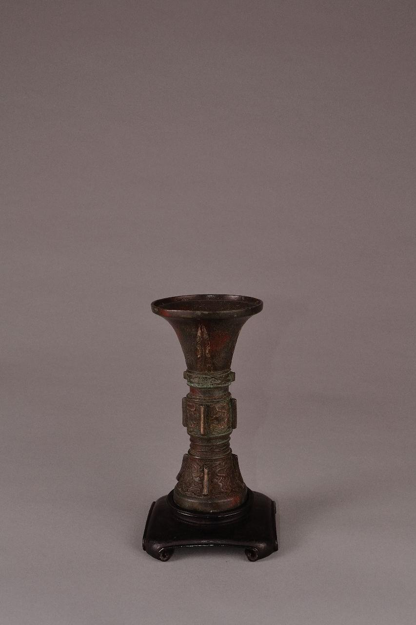 Vaso in bronzo per altare a forma arcaicistica riproducente i calici per il vino (gu). Piede troncoconico suddiviso in quadranti da costolature verticali a rilievo, corpo squadrato con costolature rilevate in corrispondenza dei vertici, bocca a tromba con labbro verticale. Il corpo è decorato con draghi stilizzati a basso rilievo e sul collo con motivo di cicala stilizzata arcaicistica. Sul piede motivi di draghi su fondo di ghirigori. Particolari ageminati in argento.