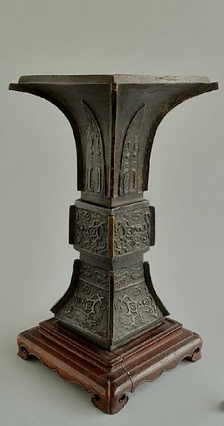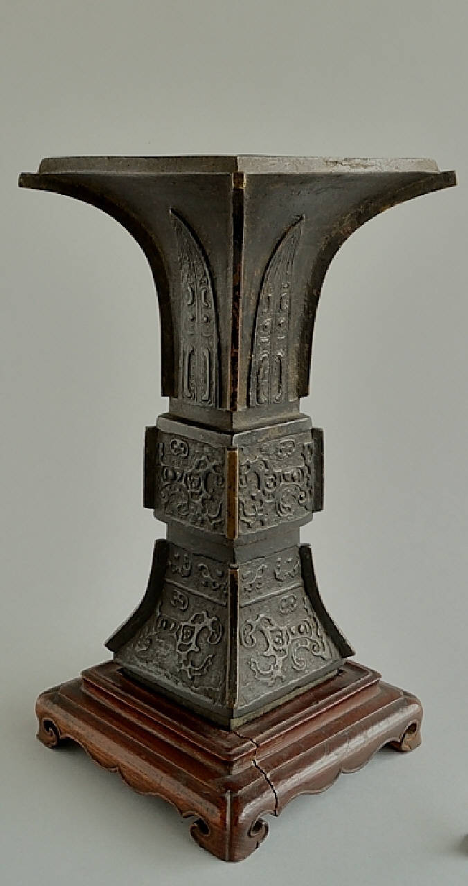 Vaso per altare, di forma arcaicistica che segue la tipologia della coppa da vino (gu), con base in legno modanata. Il corpo è a calice, con piede espanso, breve sezione centrale e bocca fortemente strombata. Ai vertici si trovano lunghe costolature longitudinali. La decorazione sul collo è a motivi lanceolati che alludono alla cicala arcaicistica stilizzata, mentre sul piede e sulla sezione centrale si trovano motivi zoomorfi molto stilizzati. L'oggetto è stato dipinto di nero. Sotto il piede si trovano alcune iscrizioni a inchiostro ormai illeggibili.