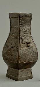 Vasetto in bronzo a pianta quadrata, con piede troncopiramidale, pancia bassa, che si rastrema al collo. Bocca leggermente espansa con labbro orizzontale sporgente verso l'interno. Sul collo si trovano due mascheroni zoomorfi con naso a occhiello per introdurre anelli mobili (mancanti). La decorazione è ripartita su cinque fasce, dall'alto in basso, il primo sotto il bordo, l'ultimo sul piede: a motivo di spirali quadrate disposte diagonalmente; a fondo di spirali quadrate disposte verticalmente, con il simbolo del monte sacro; a motivi geometrici formanti volute; a motivo di rombi campiti da punti; a grossi rombi con all'interno una fascia a spirali opposte e al centro rombi concentrici.