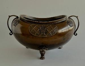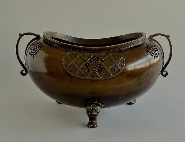 Grande incensiere in bronzo a forma di bacile con quattro piedini zoomorfi, pancia espansa, schiacciata e allungata, spalla alta che termina direttamente a bocca ovale, labbro verticale deperesso al centro. Due anse sinuose sono saldate alla spalla. L'oggetto è decorato al centro delle pareti più lunghe, in corrispondenza della spalla, da un medaglione campito da un motivo a rilievo di grata e al centro di questo con un traforo di stemma (kamon) a forma pentalobata (mokkogata) con all'interno e ai vertici cinque petali a lancetta nello stile della ninfea (kohone) o del fiore di hoya. Lo stesso motivo traforato si ritrova sulla spalla in prossimità delle anse. Il traforo non è a giorno, ma chiuso internamente da una lamina metallica. Il bronzo si presenta chiaro come l'ottone (sentokudo).