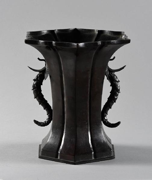 Vaso da fiori a pianta esagoale piede e bocca espansi e manici ad ansa fitomorfa. Le sei pareti sono bipartite e terminano modanate sul labbro. La forma dei manici è forse quella del bocciolo di glicine (fujibana) sormontato da tre foglie divergenti.