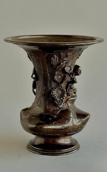 Vaso da fiori in bronzo dal ventre appiattito con quattro sporgenze a stella, piede espanso spiovente liscio, alto collo e bocca ampia strombata. Sul collo, a rilievo, una figura seduta fra crisantemi (kiku) più grandi di lui, con un fiore di questi in mano, su un fondo inciso di greche ripetute (raimon).