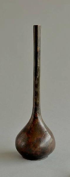 Vaso a bottiglia con pancia piriforme a base piatta e lunghissimo collo fine. Il metallo ha acquisito una patina maculata con toni rossi accentuati.