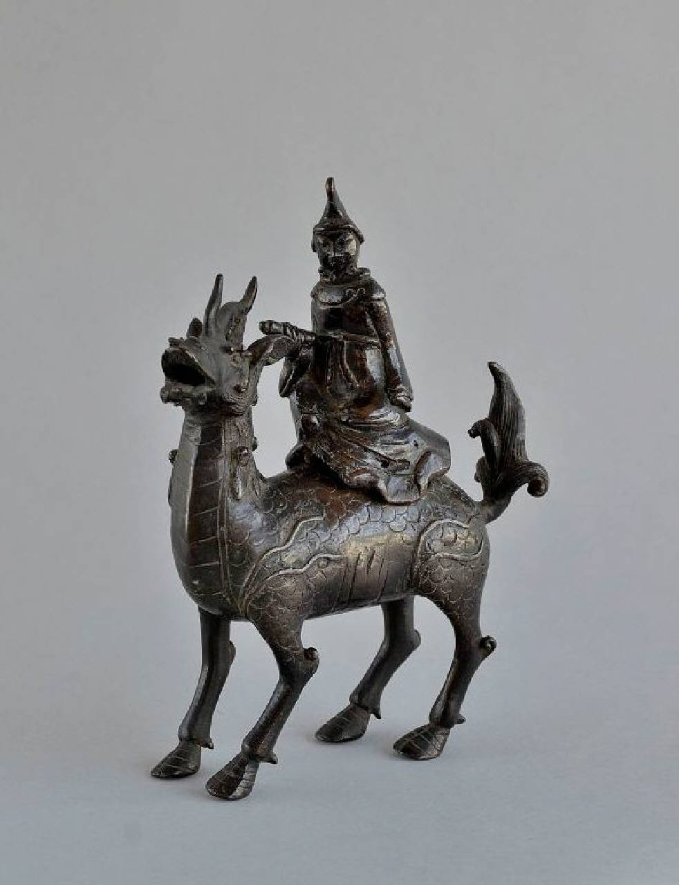 Incensiere a forma di chimera cinese qilin, caratterizzato dalla presenza di tre corna disposte in linea fra loro e raffigurato stante, con la coda alzata. Il foro del fornello, ricavato sul dorso dell'animale, è chiuso da un coperchio a forma di personaggio seduto con un ginocchio alzato, che indossa un cappello a punta e porta la barba divisa in due grandi riccioli, mentre regge un rotolo nella mano destra.