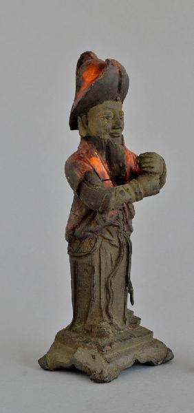 - NOTIZIE STORICO CRITICHE Sembrerebbe trattarsi di Zhou Cang, assistente di Guan di, il quale nell'iconografia classica impugna un'alabarda.\nCostituisce un insieme con i Num. inv. C120, C118.