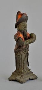 Scultura in bronzo laccato, raffigurante l'attendente a una divinità principale. Il personaggio è ritratto stante, con un copricapo e una lunga veste. Le mani sono congiunte e sovrapposte a pugno, per reggere un oggetto ora mancante. La statuetta fa corpo con la base quadrangolare modanata. Parte della laccatura che ricopriva completamente la statuetta assieme a un impasto grezzo di un materiale non definito, è andata persa, lasciando scoperta la statuetta di bronzo sottostante con maggiori particolariincisi.