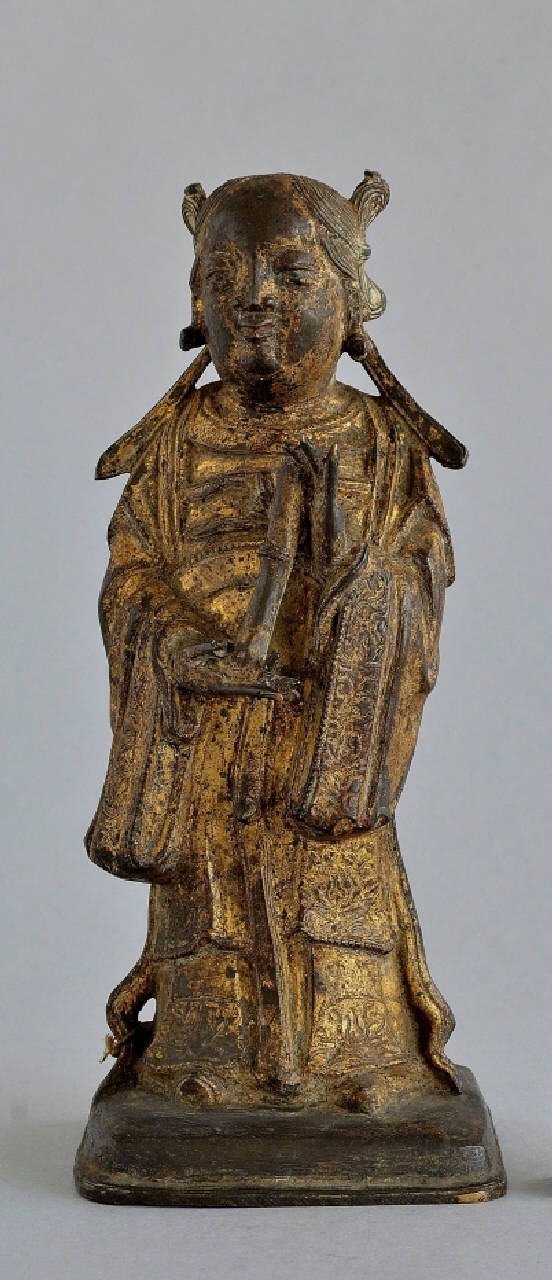 Scultura in bronzo di fanciulla, stante su un ampio piedistallo quadrato. La figura ha i capelli raccolti in due ciocche, indossa una veste costituita di giacca a lunghe maniche e gonna con abbondante panneggio, e tiene nella mano destra un rotolo il quale è retto verticalmente con le dita della mano sinistra. Patina scura e porosa.