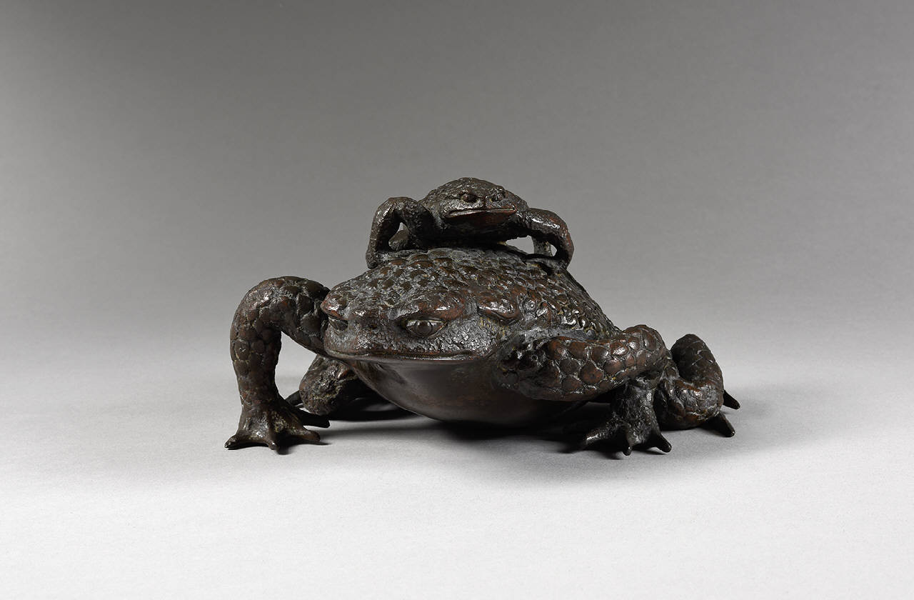 - NOTIZIE STORICO CRITICHE La scultura è molto ben eseguita. Lo stile naturalistico che si riscontra in quest'opera in epoca Meiji suscitava molta ammirazione da parte dei viaggiatori occidentali. Il gusto per oggetti della natura come questi, pur legati alla tradizione figurativa giapponese, inizia in Giappone alla fine del XVIII secolo quando, con la diffusione della cultura borghese dei chonin, l'arte e le opere in metallo cominciarono a diffondersi nella società giapponese. Nella seconda metà del XIX secolo visto l'apprezzamento occidentale, questa produzione si intensificò per l'esportazione, raggiungendo il suo culmine con le prime partecipazioni ufficiali alle Esposizioni Universali, come quella di Vienna del 1873.\n\nSi tratta probabilmente dell'oggetto esposto alla Mostra d'arte industriale in Milano del 1874 come "n. 941 Gruppo di rospi, bronzo giapponese antico".