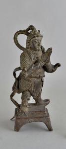 Sscultura in bronzo di Weituo (Skanda), stante su una base rettangolare con quattro piedini ai vertici, nella tipica posizione che lo contraddistingue, a mani congiunte per i palmi, ma privo della spada che solitamente la divinità regge fra le braccia. La figura indossa un'armatura composta di elmo con pennacchio, corazza e gambali e presenta uno svolazzo che da dietro la testa passa sotto gli avambracci fino ai piedi.