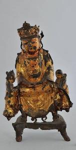 Scultura in bronzo dorato rappresentante Guanyin "dei mari del sud" con assitenti oranti. Guanyin è seduta su un seggio a quattro gambe, nella posizione del loto (padmasana), le mani in mediatazione (dhyanamudra). Il bodhisattva indossa un ampio manto, gioielli e corona. Di fianco a lei, molto più piccoli, si trovano Sudana, con le mani nel gesto di preghiera (namaskaramudra), e Longnu nell'atto di porgere il gioiello.