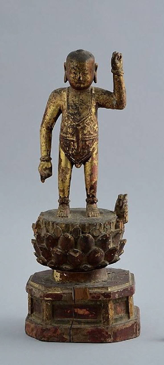 Scultura costituita da un pezzo unico di legno, laccato, dorato e dipinto, raffigurante il principe Shakyamuni bambino su un fiore di loto. Il Buddha è rappresentato nudo, con addosso solo uno scalda ventre che denota la sua origine principesca, mentre, dopo avere compiuto i sette passi, tende la mano sinistra al cielo e la destra alla terra. Il loto e il piedistallo rettangolare sottostante sono dipinti di rosso.