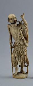 Statuina in avorio di Li Tieguai, immortale taoista, raffigurato come un uomo calvo e barbuto che incede con una stampella. Alla sua sinistra una borsa e una ciotola appese a tracolla. La mano sinistra è alzata come per reggere qualcosa.